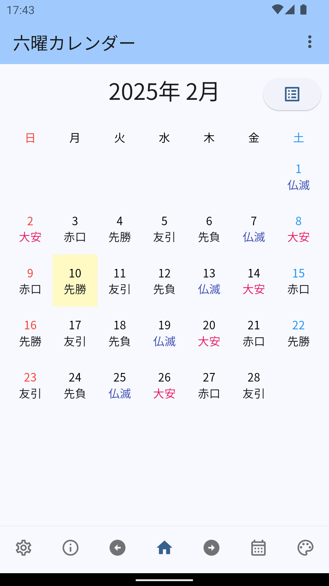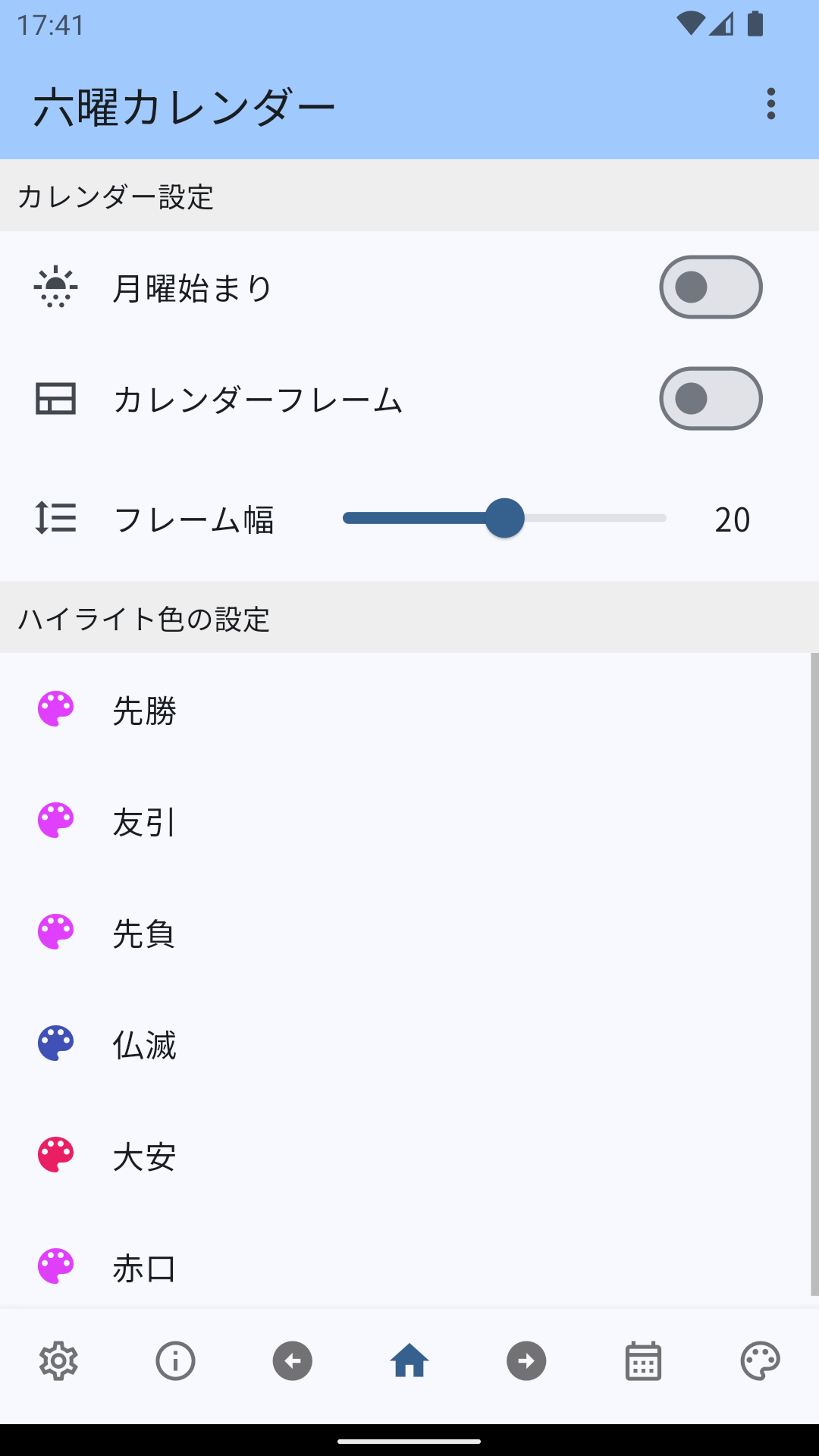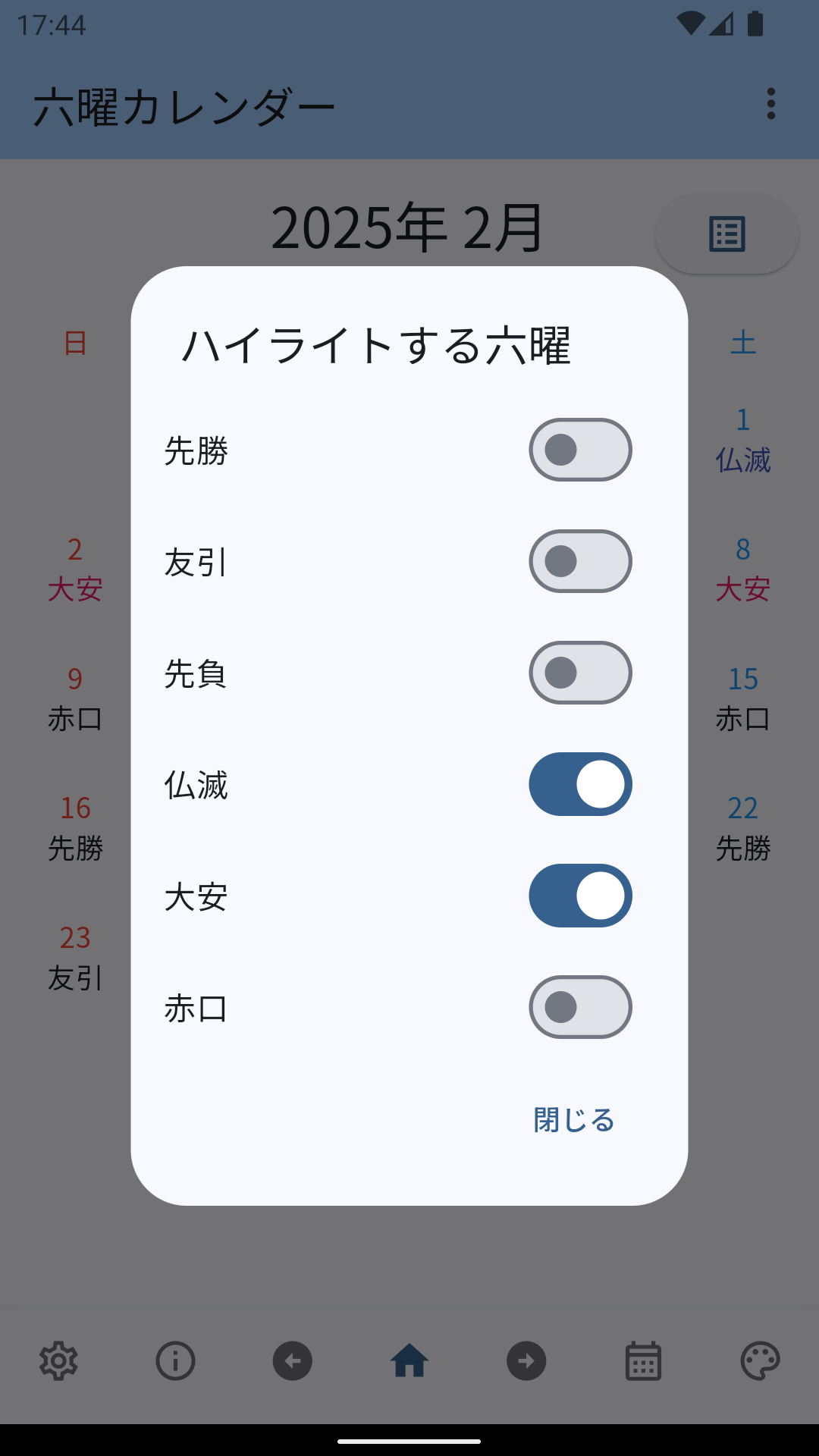 You can set it to highlight specific Rokuyo (e.g. Taian or Tomobiki) to make it easier to visually find the date of the Rokuyo you are looking for. You can also customize the display style from the settings menu. It is simple, but you can use it to suit your style.