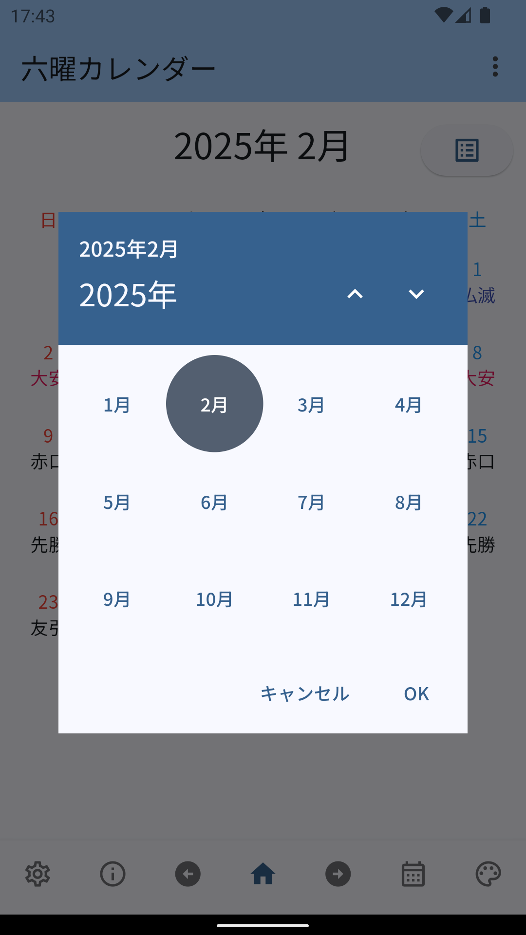 When you start the app, the calendar for the current month will be displayed, so you can see the Rokuyo for that day at a glance. You can display the calendar for the previous and next month by swiping left and right. You can also specify the year and month to immediately switch to the calendar for that year and month.