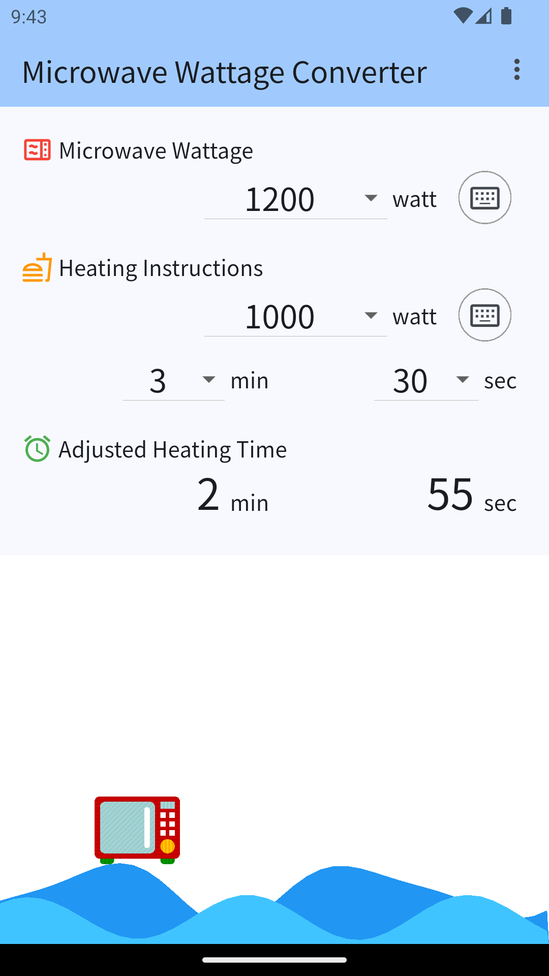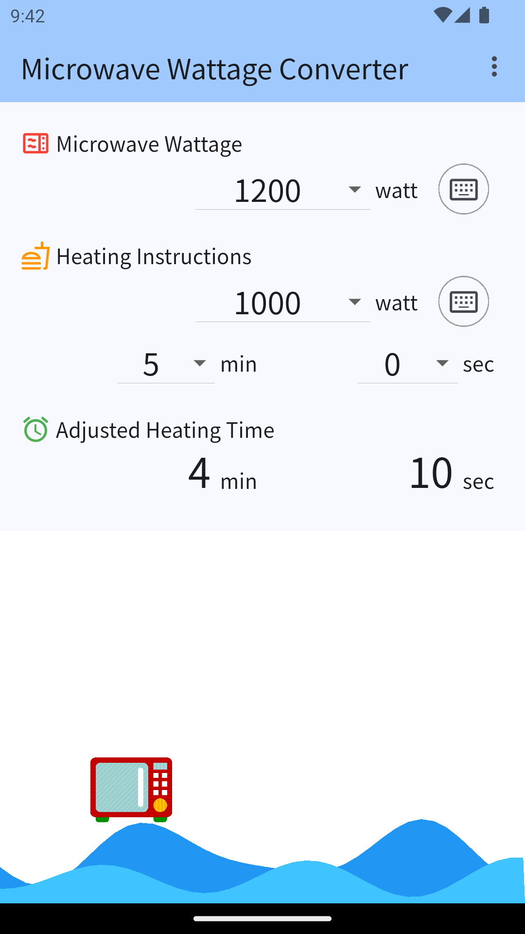 Using the app is very simple. First, select the wattage of your home microwave (for example, 500W or 600W). Next, enter or select the wattage and heating time listed on the package. The app will then automatically calculate the actual heating time you need. This way, you can heat your food for the optimal amount of time in your own microwave.
